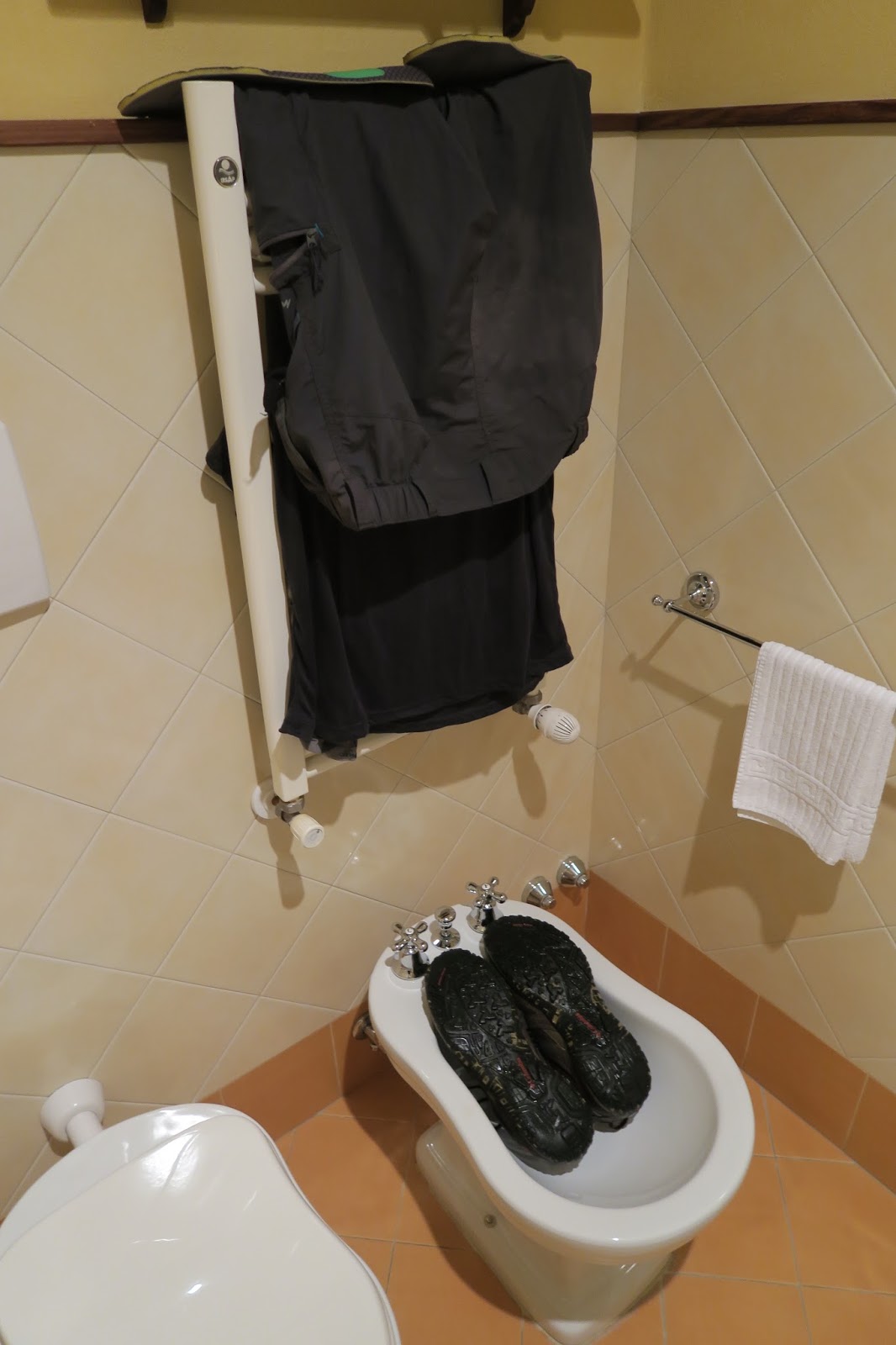 Finalmente esco da quella palude e capisco che mi sto riavvicinando alla civiltà, o meglio dovrei dire inciviltà visto che è rappresentata da una discarica abusiva. Saltato (quasi) l’ultimo torrente dopo ancora un po’ di fango arrivo sull’asfalto e dopo aver scoperto che qualche ramo mi ha distrutto il poncho “ Made in China”, trovo un muretto su cui sedermi per mangiare qualcosa. Non mi fermo molto perché sono bagnato e non fa nemmeno tanto caldo visto il tempo. Prosegue l’asfalto e in prossimità di una curva sento una signora che mi chiama, mi chiede se sto andando a Firenze e se può offrirmi un caffè, accetto volentieri e mi fa accomodare sotto un porticato cosi ne approfitto anche per darmi una asciugata ai piedi e cambiarmi le calze, per quanto poco può servire visto che tanto le scarpe sono fradice dentro e fuori. Scambio due chiacchiere con la signora e poi riparto verso Badolo, dopo qualche km passo un bivio e dopo un po’ grazie all’applicazione sul telefono mi accorgo che non sto più seguendo il percorso, quindi torno indietro e prendo l’altra strada che con una ripida salita sale sui monti verso Badolo. Per fortuna ogni tanto la strada va in piano perché è una faticaccia, sopratutto quando le salite sono fangose ed ogni volta che arrivo in cima e prendo fiato sembra essercene una peggio. Quando il percorso torna sull’asfalto arrivo al cartello di Badolo, una rapida controllata al telefono però mi ricorda che per raggiungere la locanda di oggi dovrò scendere giù fino a Cinque Cerri, almeno 5 km fuori percorso ma purtroppo non ho trovato altro quando ho fatto tutte le prenotazioni. Una discesa di fango melmoso attraversa i campi, non so davvero come ho fatto a passare la giornata senza scivolare per terra. Una quindicina di minuti sulla statale e arrivo finalmente alla meta, dopo quasi 35 km. Prima di rilassarmi però devo lavare via tutto il fango e stendere tutto per domani. La cena la farò qui all’agriturismo, un po’ caruccio ma non ho la forza di andare fuori a cercare altro. Certo che per 50 euro almeno la TV free avrebbero potuto lasciarla.