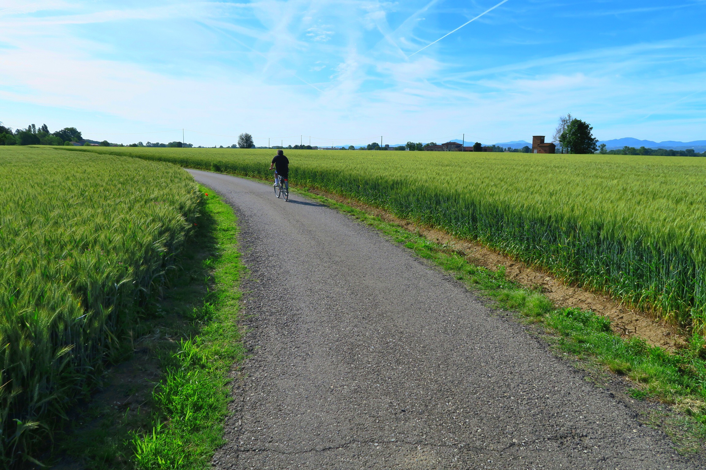 Parto presto lungo la via Emilia in pieno orario di punta, tra auto e camion che sfrecciano. Dopo un paio di km devio a destra su una strada tra i campi di mais, ho già capito che anche oggi sarà gran asfalto ma se non altro non c’è nemmeno una macchina, qualche trattore ogni tanto e basta.