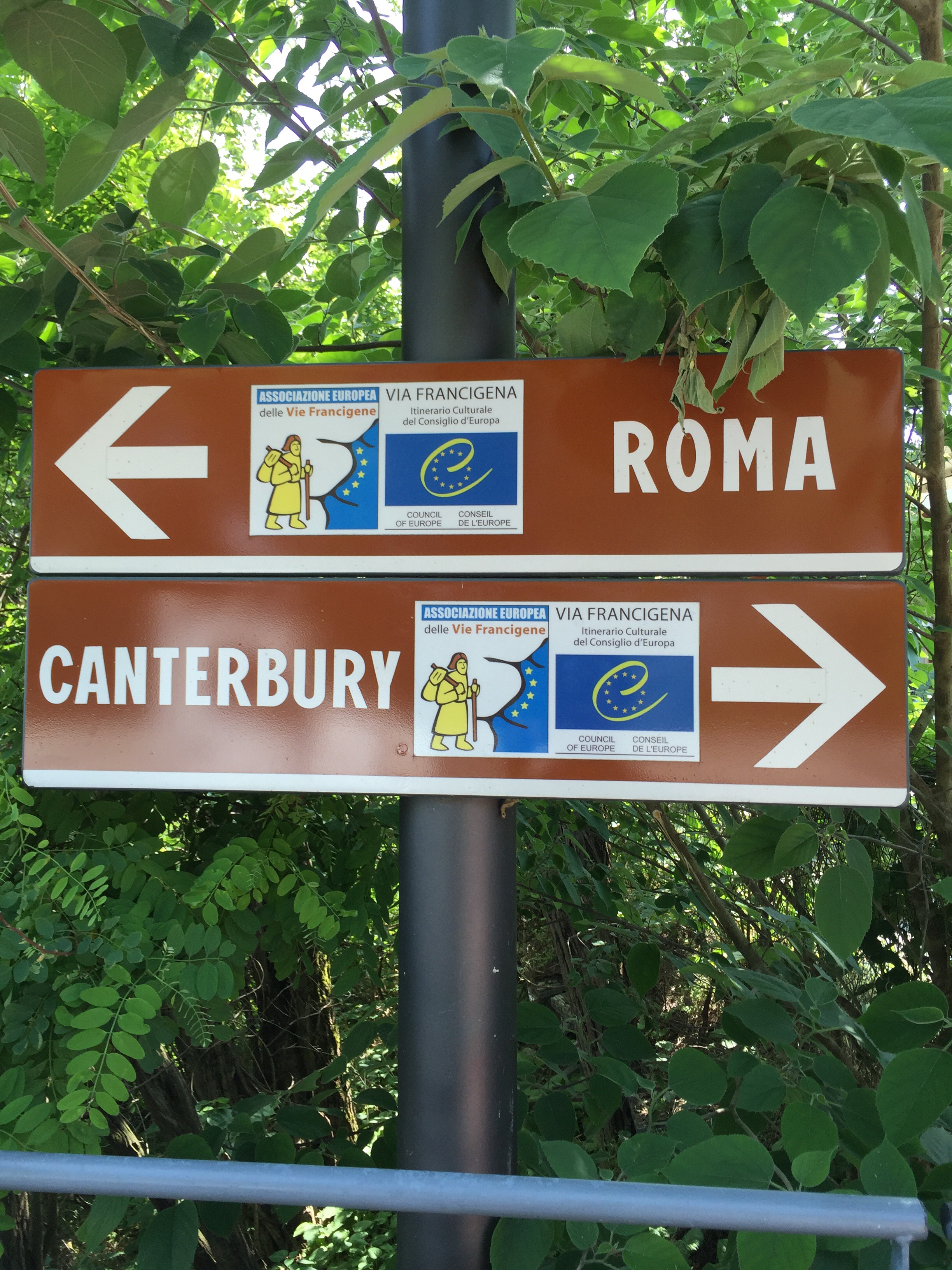 Quando torna, l’asfalto scende ripido per poi risalire passando accanto ad un cimitero dove fuori trovo una fontana, e poi sale ancora fino ad un bivio. A destra la via Francigena, a sinistra Costamezzana, la meta di ieri dei bergamaschi e del Francese. Visto che non mangio da ieri pomeriggio faccio tappa al bar e appena arrivo scopro che perdermelo sarebbe stato un vero peccato. Già da fuori trovo il simbolo del pellegrino in bella vista, poi dentro trovo la mappa della Francigena con a fianco in una cornice una Compostela. Il fratello del proprietario del bar è un pellegrino che ha fatto il cammino di Santiago nel 2010 e, sapendo cosa significa, ha un occhio di riguardo verso i pellegrini che passano di lì, tanto che mi chiede la credenziale per poter apporre il loro personale timbro .