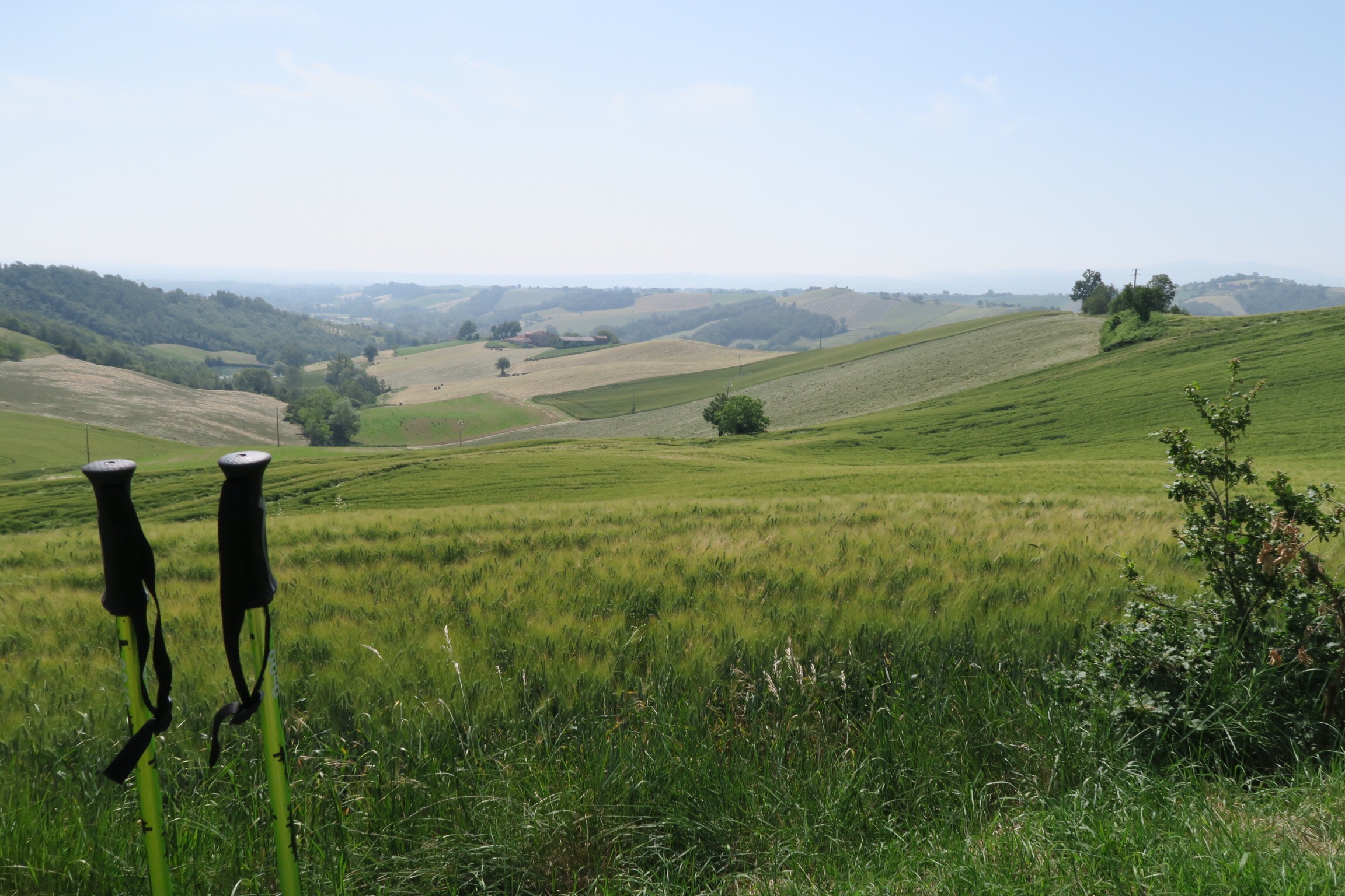 Subito dopo i primi 500 metri lascio l’asfalto per uno sterrato che poi sale, finalmente oggi i panorami cambieranno e vale la pena la fatica di qualche salita. La strada prosegue sulle cime delle colline con qualche tratto di asfalto alternato da sterrati e strade erbose, mentre ai lati un bellissimo paesaggio collinare che non vedevo l’ora di trovare.