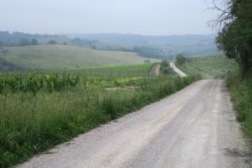 Parto verso le 7:30 e dall’ostello prendo la salita che arriva in città, i segnali della Francigena mi fanno praticamente fare il giro del centro per poi discendere quasi dalla stessa parte e poi infilarmi in una lunga e polverosa strada bianca che passa tra i vigneti del Chianti. Qui trovo Giuseppe, che ho conosciuto a San Miniato e procediamo assieme.