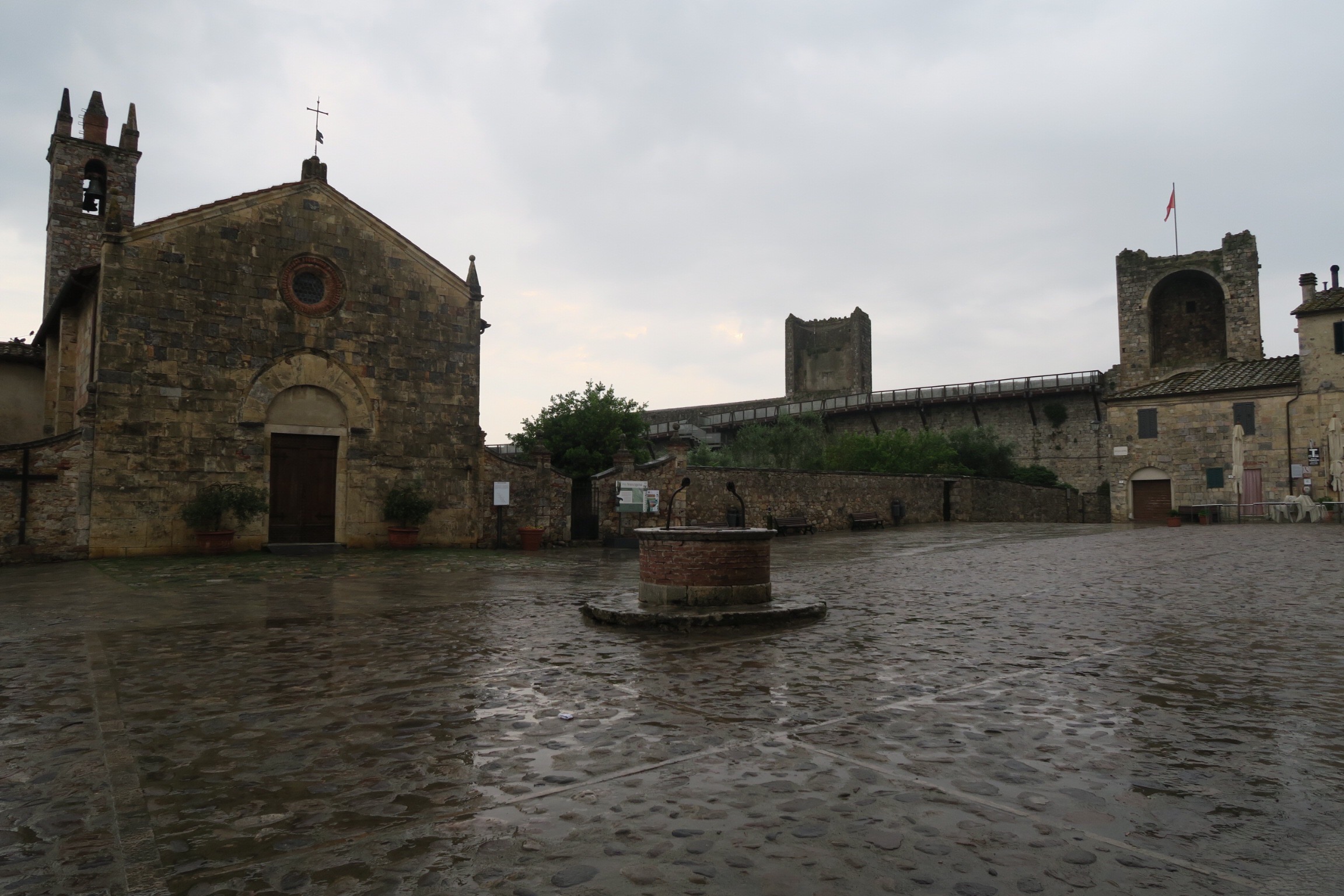 Un breve tratto di sterrato seguito da una strada trafficata ci porta subito a Monteriggioni, che quasi tutte le guide indicano come tappa. Facciamo colazione al primo bar giusto in tempo per infilarci anche il poncho e ripararci così dalla pioggia e poi saliamo per per attraversare le mura del castello, dove all’interno vi sono bar, hotel e ristoranti. Così a prima vista sembra anche attrezzato per ospitare numerose sagre e feste.
