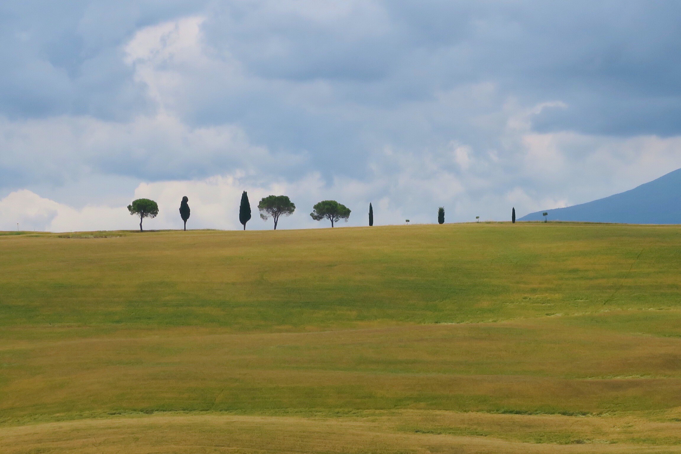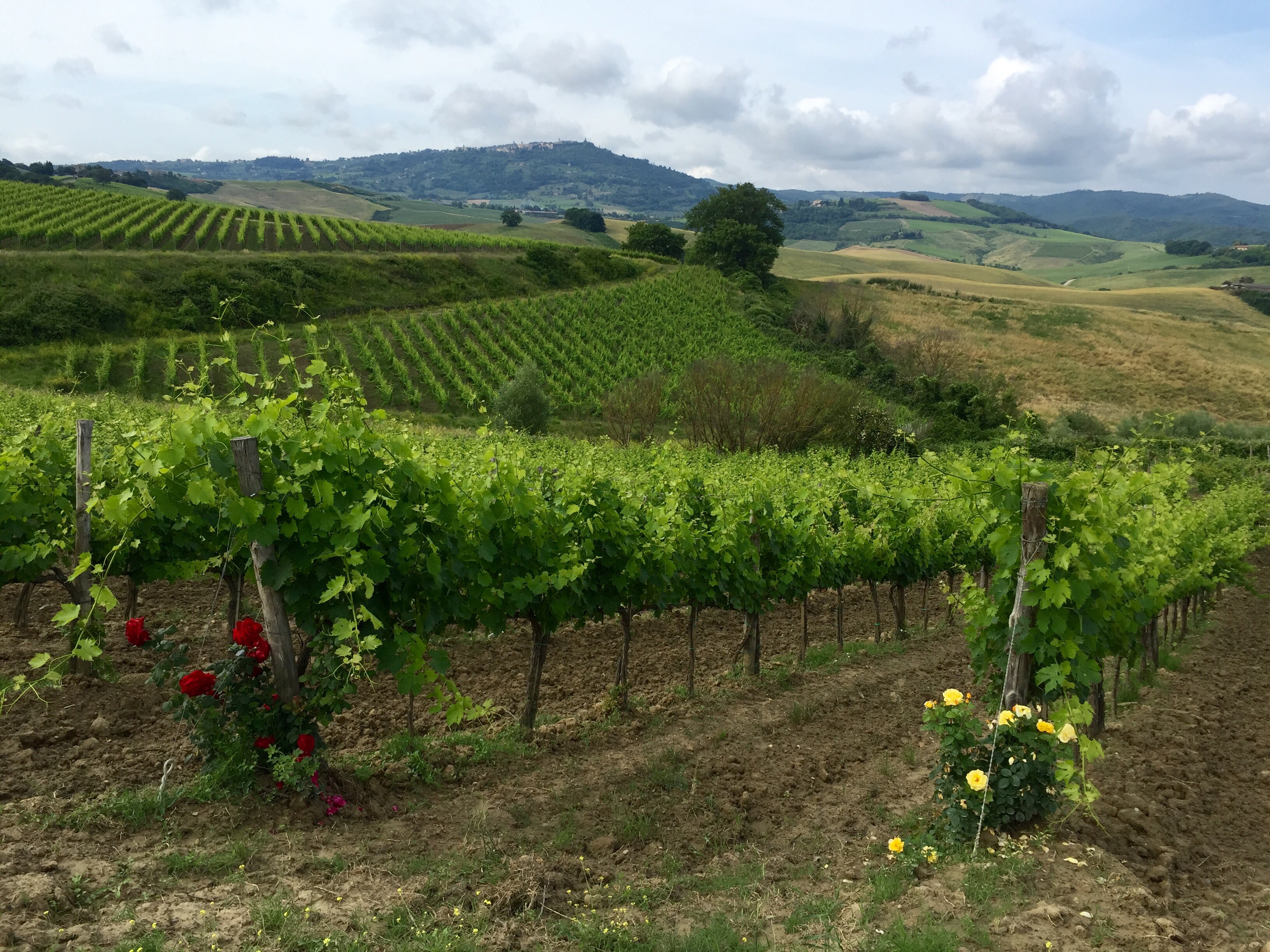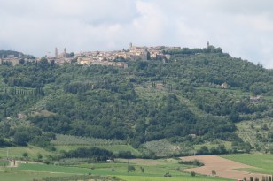 Mi trovo su di una lunghissima strada collinare che attraversa tutto il parco naturale della Val d’Orcia, attraverso vigneti e panorami stupendi e ad una decina di km sulla destra la vista di Montalcino.