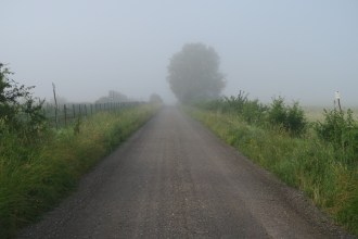 Parto facendo una variante che porta a costeggiare la ferrovia su una larga strada sterrata, ci sono solo la nebbiolina mattutina e il silenzio ad accompagnarmi.