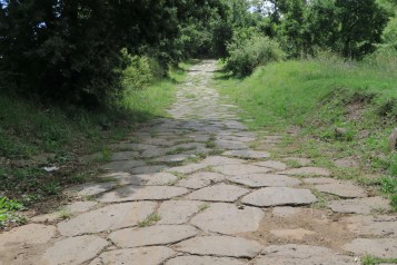 Continuo sulla strada che mi porta fuori città deviando su una ripida discesa che diventa sterrato, più avanti poi mi trovo a camminare su un’antico ma ben conservato basolato romano, un bel tratto lungo.