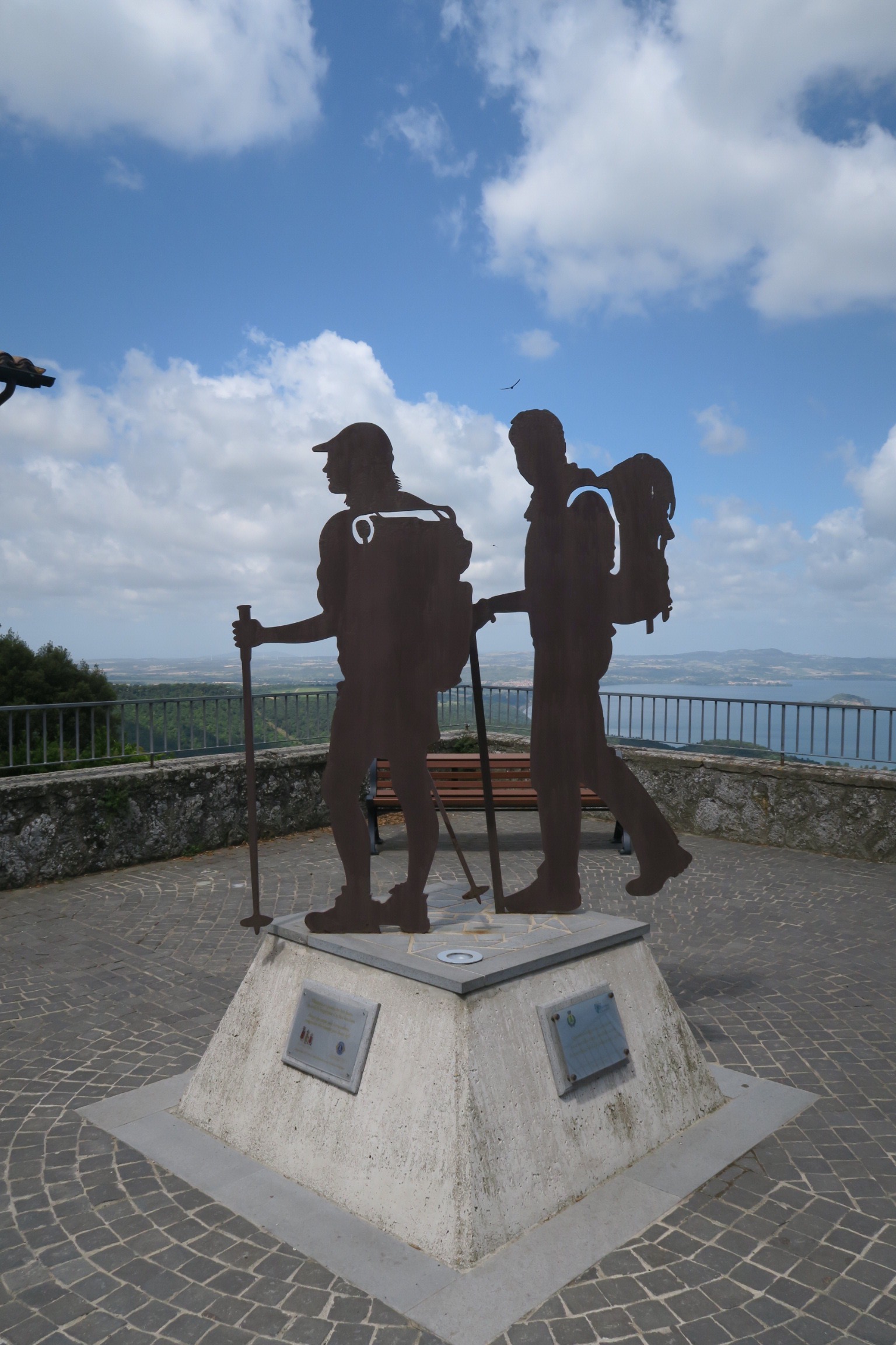 Mi fermo per un po’ a fare qualche foto e più tardi riprendo scendendo degli scalini dalla parte opposta del giardino di fronte alla Rocca. L’ostello per sta notte è a 3 km da Montefiascone, ma sempre sulla Francigena, così la tappa di domani sarà ancora più corta. Subito dopo la piccola scalinata trovo una scultura raffigurante due pellegrini, con dietro ancora la stupenda vista del lago.