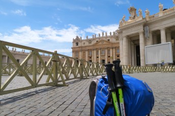 Da qui in poi però la tappa diventa un lungo ed estenuante cammino in mezzo al traffico, salvo solo un piccolo tratto nella riserva naturale di Monte Mario dove una volta raggiunta la cima, scendo lungo la strada che costeggia una scuola oggi aperta per i seggi elettorali, continuo a scendere fino in città, passo un paio di parallele fino a raggiungere la strada che arriva dritta alle porte della Città del Vaticano e poi, concludendo questi ultimi 32 km di oggi, finalmente dentro Piazza San Pietro.