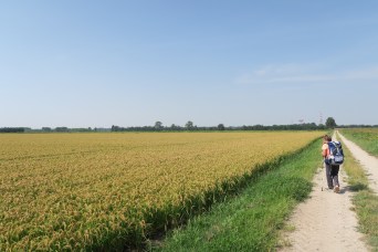 Mi raggiunge Grazia e poi ci mettiamo subito in cammino facendo una deviazione per visitare il santuario della Madonna della Bozzola, fuori Garlasco. Breve visita, ci facciamo timbrare la credenziale e poi ripartiamo subito e a parte una piccola incomprensione con le indicazioni che ci fanno sbagliare strada, ci immettiamo poi sulla Via. Fare il cammino al contrario invece che verso Roma non è semplicissimo, senza GPS credo sarebbe impossibile, se non lo si tiene controllato è facile sbagliare strada. I segnali della Francigena per lo più sono rivolti dalla parte di chi scende così noi procedendo dalla parte opposta spesso non riusciamo a vederli.