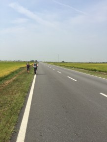 Oggi non c’è poi molto da raccontare, appena usciti da Vercelli la via continua sempre su asfalto, passando per un paio di paesi quasi fantasma, senza bar e senza anima viva. Fino a quando finalmente arriviamo a Lignana, non che sia molto più vivo ma almeno c’è un bar aperto. Intanto un paio di amici ci salutano, hanno voluto fare un tratto di strada con noi, sopratutto con Grazia, ma ora tornano a Vercelli dove hanno lasciato l’auto.