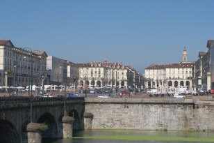 Quando più avanti ci separiamo da Piermario che torna a casa, Torino oramai non è molto lontana. Continuiamo lungo l’argine tra ciclisti e persone che fanno jogging e infine arriviamo al ponte dove da una parte spicca il cupolone della Chiesa della Gran Madre di Dio, dall’altra la grande piazza Vittorio Veneto .