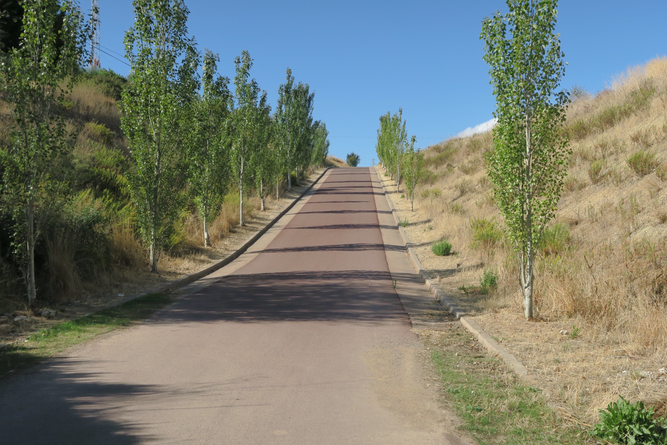 Dopo qualche km tra vigneti arriviamo su una lunga pista ciclabile rossa che porta a Logrono, percorriamo il ponte sul Rio Ebro e giungiamo nella grande città dove ci fermiamo per pranzo in un piccolo bar; molti pellegrini incontrati nei giorni scorsi oggi si fermeranno qui ma noi procederemo oltre. Uscendo dalla città percorriamo un lunghissimo e bellissimo parco tra il verde, con bambini che giocano e famiglie che passeggiano, parco che poi si immette in un’altra lunghissima pista ciclabile di 6 o 7 km che pare non finire mai.