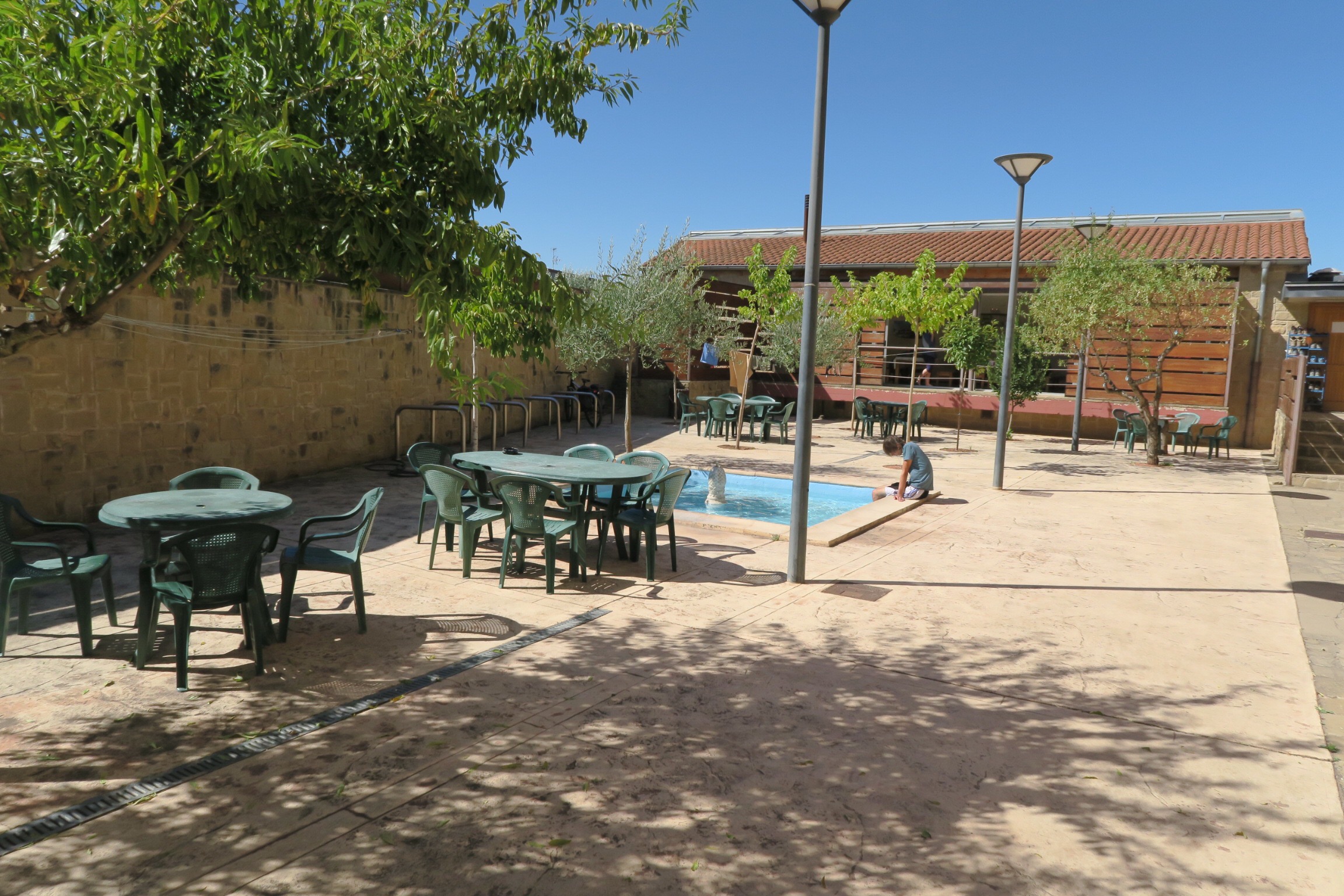 La strada di per sé non sarebbe impegnativa non fosse per il sole caldo e una quantità esagerata di mosche che non ci lasciano in pace; 5 km ancora di strada tutta così, percorsa litigando con le mosche e finalmente arriviamo nel piccolo paesino di Azofra, un agglomerato con un paio di negozi, un paio di bar e l’ostello Comunale molto carino con tanto di “piscina” per rinfrescare i nostri piedi stanchi e delle piccole camere per 2 fatte in legno, un piccolo albergo eco sostenibile praticamente.