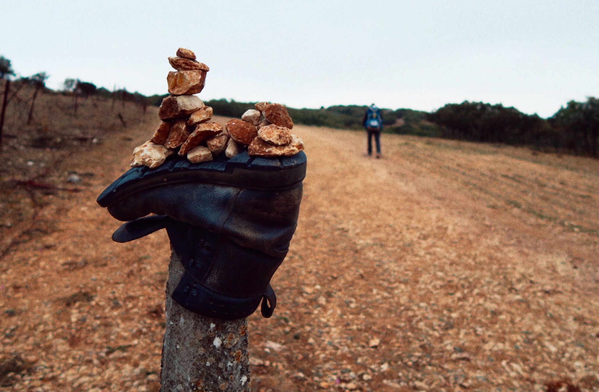 Ci mettiamo in cammino sulla strada e dopo soli 2 km arriviamo ad Atapuerca mentre è ancora buio; la attraversiamo mentre tutto dorme ancora e giriamo su uno sterrato che inizia a salire. Alle prime luci dell’alba stiamo ancora salendo, ma ora su uno sterrato disseminato di rocce, fino ad arrivare in cima dove si presenta un panorama abbastanza arido e desolato.