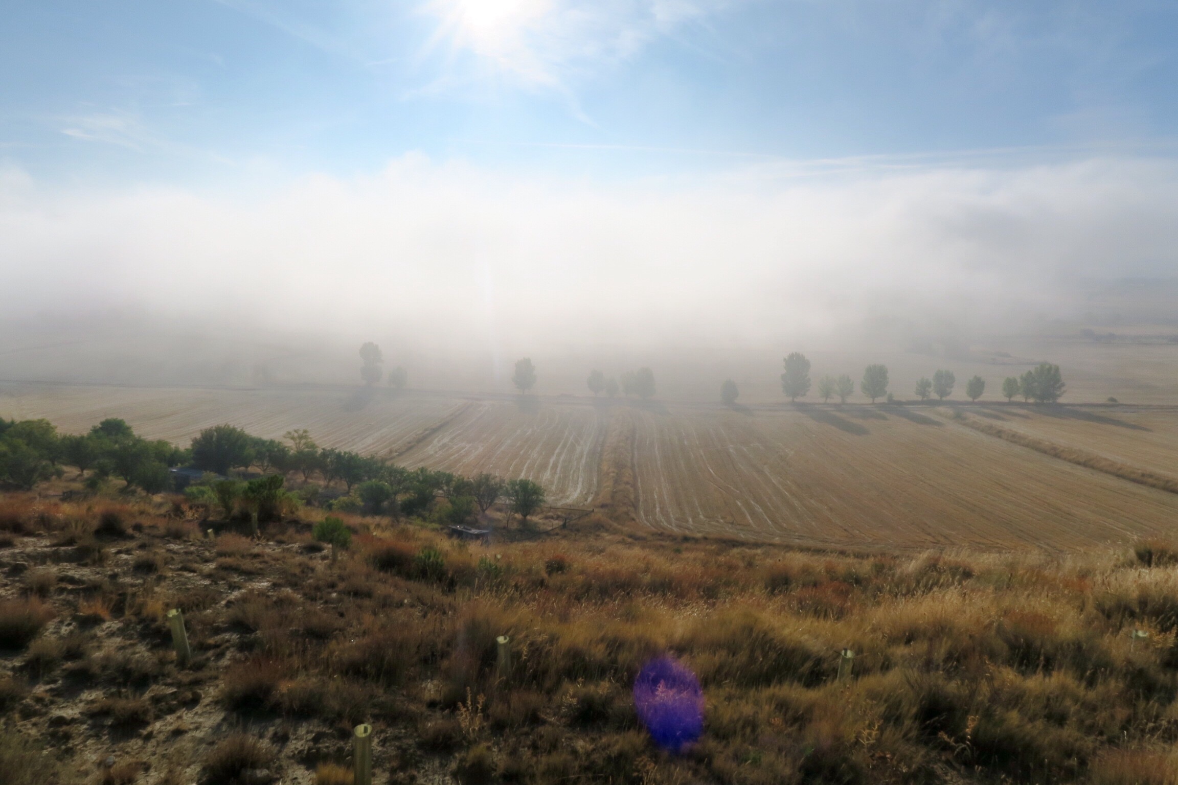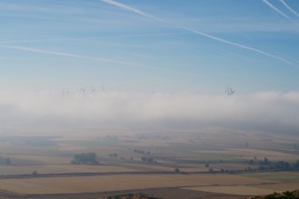 Arrivati quindi a Castrojeriz ci mettiamo in cammino lungo lo sterrato che tra la nebbia ci porta presto ad una lunga salita verso un piccolo altopiano dove all’orizzonte si intravedono solo delle pale eoliche.