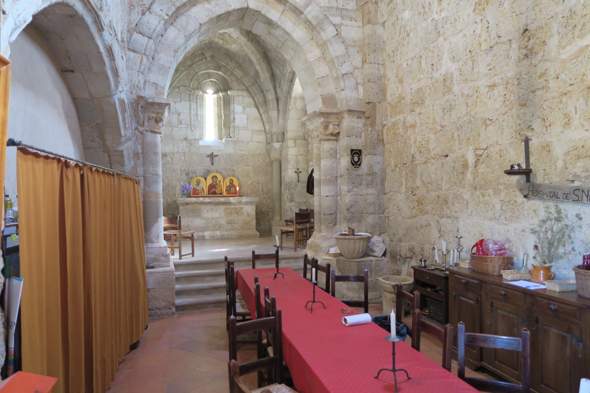 A 10 km circa dalla meta di oggi passiamo di fronte all’albergue di San Nicolas, una piccola chiesetta ristrutturata ed unico albergue sul cammino di Santiago gestito da ospitalieri Italiani della confraternita di San Jacopo; ovviamente entriamo invitati gentilmente da Anna, l’ospitaliera di turno, che ci offre anche il caffè. E’ un posto molto piccolo, carino ed accogliente anche se particolare in quanto è sprovvisto di corrente, con tutti i “problemi” che ne derivano; ma non manca proprio nulla e chi se ne occupa ti fa sentire davvero a casa.