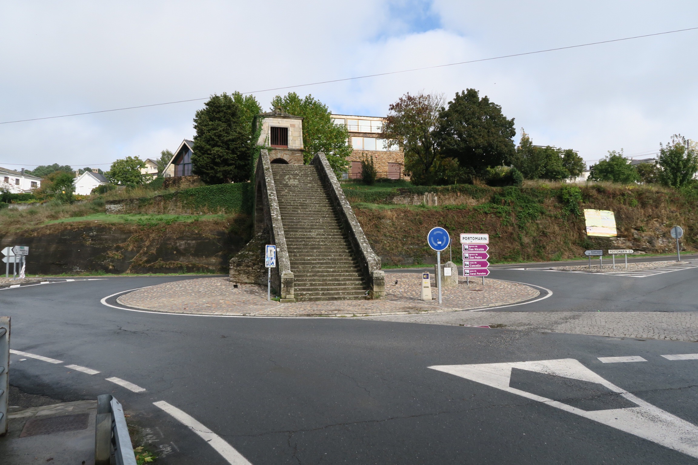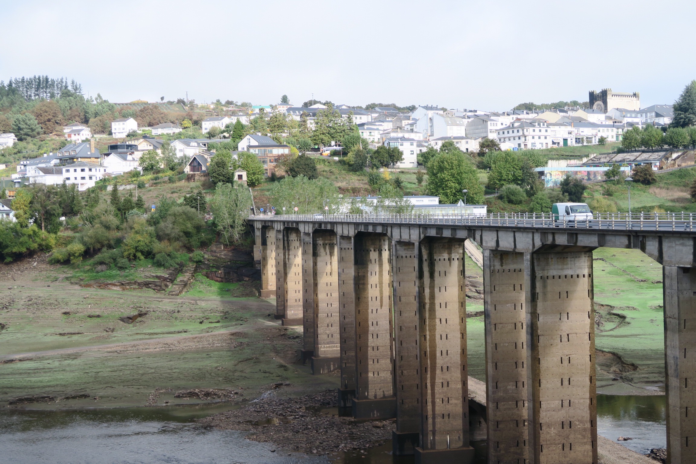Al di là del ponte e dopo una scalinata e una salita arriviamo ad un bar/ristorante dove ci fermiamo per pranzare, stanco di bocadillio (panino) mi prendo una pizza che ovviamente è una di quelle surgelate, anche se il prezzo non lo è. Ripartiamo appena finito di mangiare e, attraversando un altro ponte, praticamente il cammino ci fa passare dalla città anche se si potrebbe evitare, accorciando un po’ la strada; una pausa la dovevamo comunque fare.