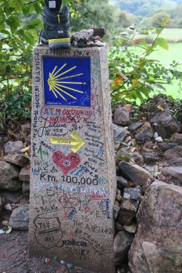 Verso le 10 passiamo davanti al cippo che indica gli ultimi 100 km a Santiago, da qui o meglio già da Sarria abbiamo già potuto incontrare gruppi di pellegrini partiti proprio per far gli ultimi 100 km, il minimo richiesto per poter ricevere la Compostela, per chi la vede come un trofeo assolutamente da avere.