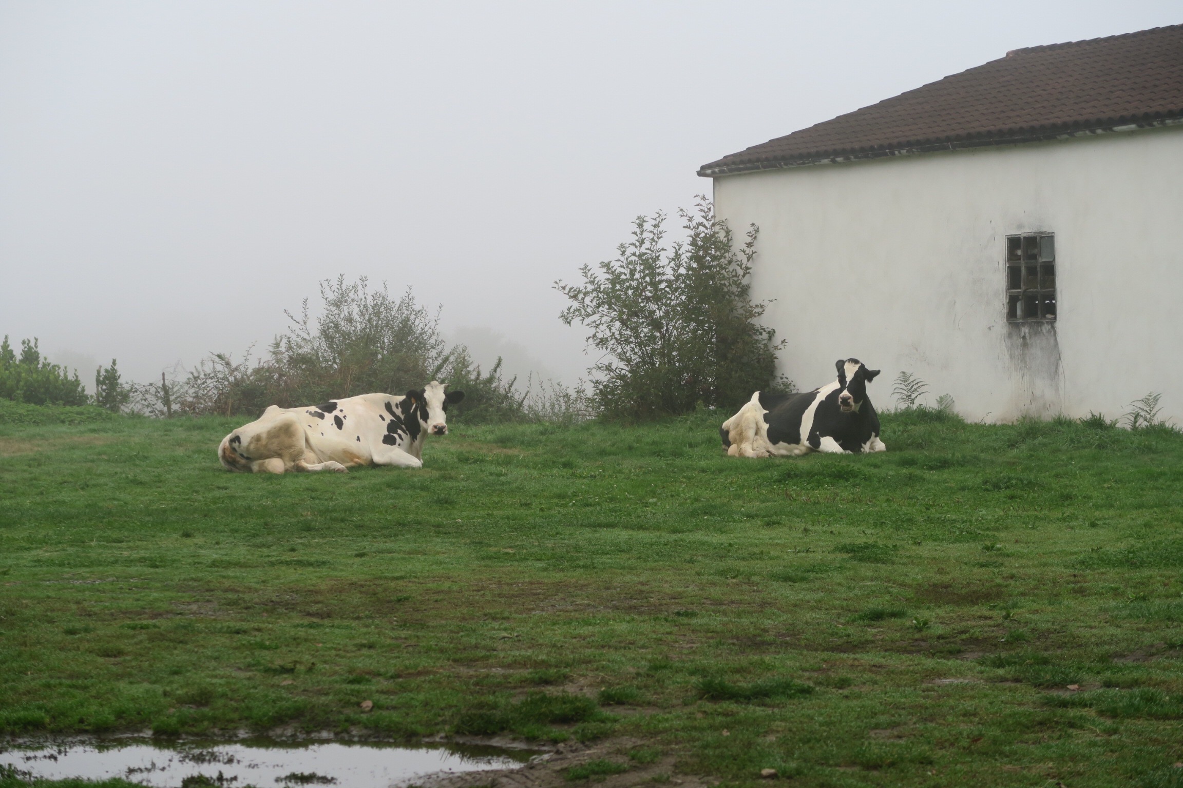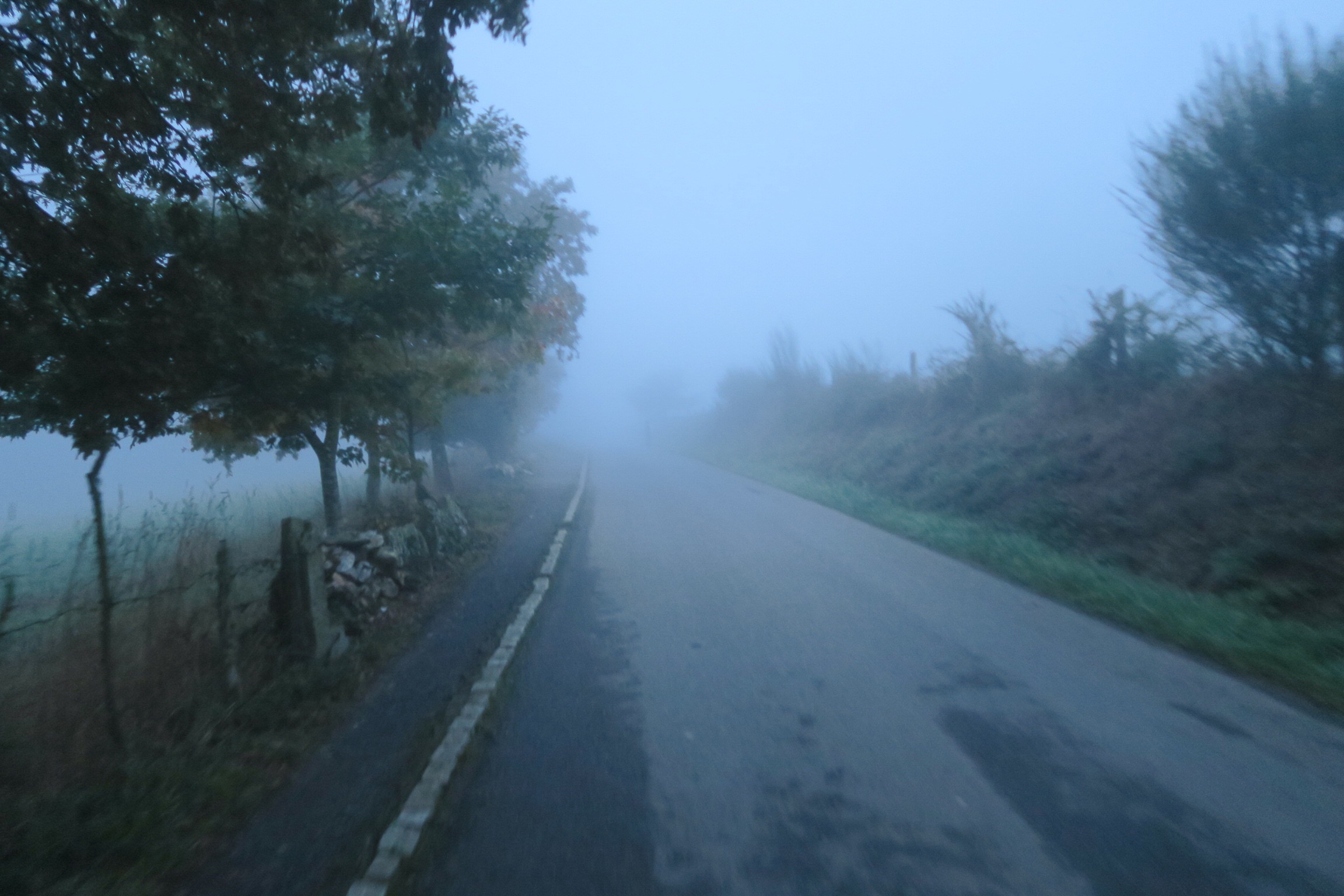 Partiamo dall’abergue abbastanza presto, anche perché l’unico bar del paese è ancora chiuso, c’è buio ma sopratutto c’è la nebbia e quando, dopo qualche centinaio di metri, iniziamo una lunga salita, la visibilità è veramente poca; con la torcia praticamente riusciamo a vedere solo che stiamo seguendo lo sterrato ma nient’altro.