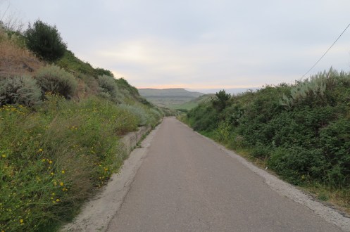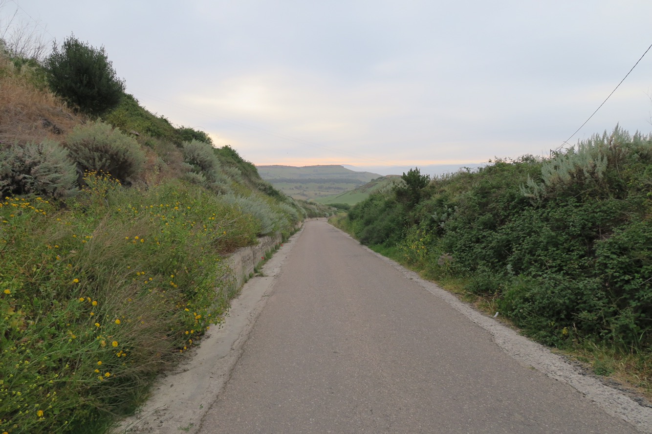 Recuperate un po’ le energie riparto per i 7 km che ancora mancano per arrivare a Chilivani, scendo le scale affianco la basilica e mi immetto su un lungo rettilineo asfaltato, il caldo incomincia a farsi sentire intanto. Arrivato in prossimità di una statale giro a sinistra e costeggio la carreggiata con le auto che sfrecciano, per fortuna dopo un km circa svolto a destra su una strada dove invece di auto non ne passa nemmeno una.
