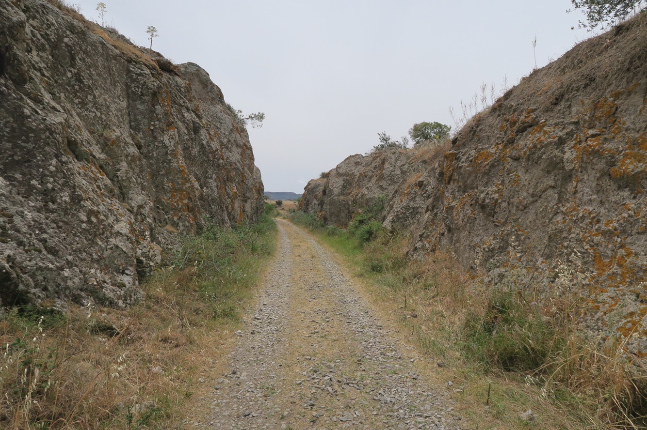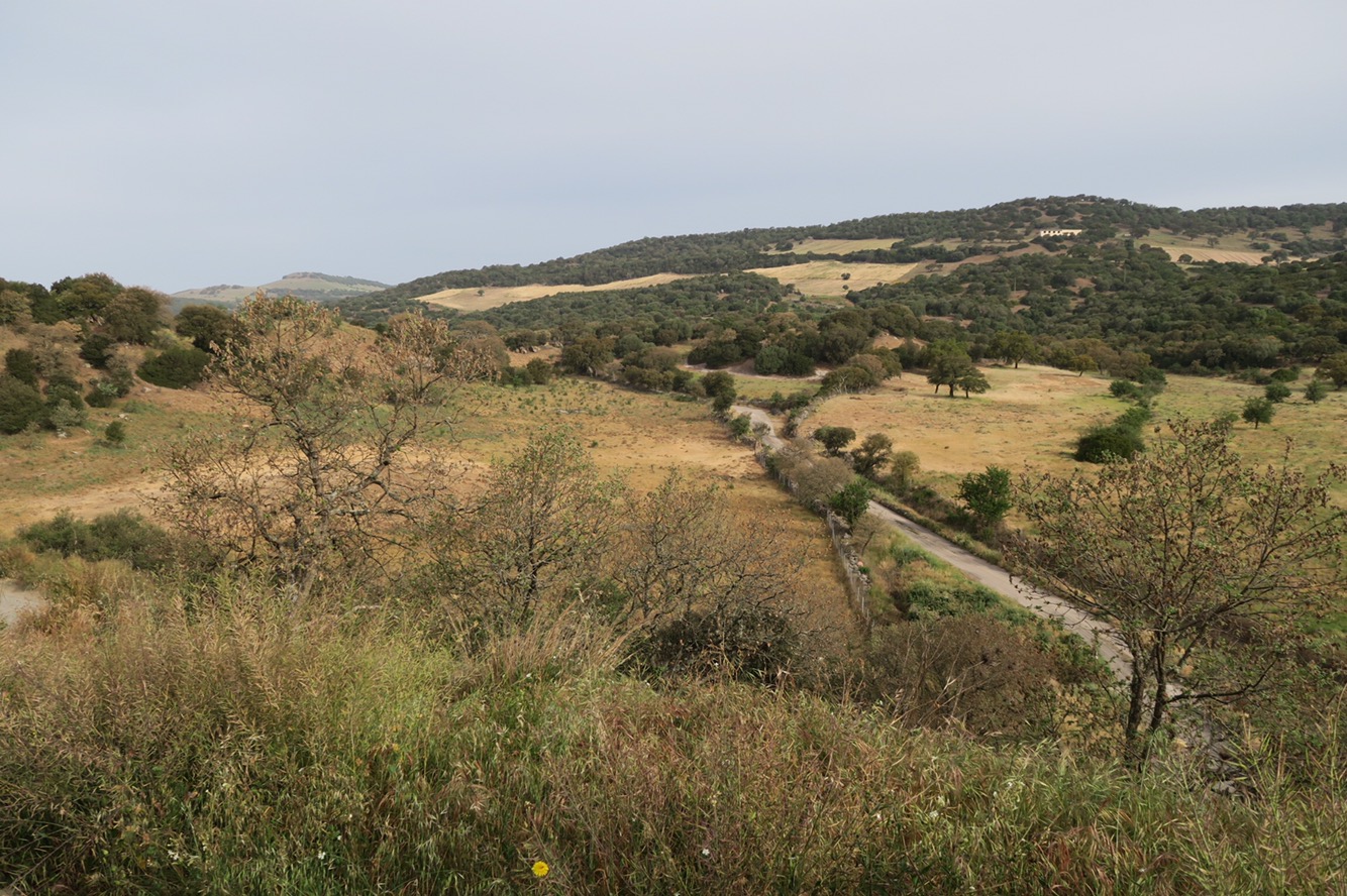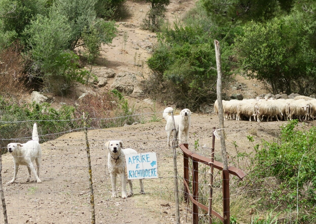 Lungo lo sterrato incontro 5 o 6 di questi sbarramenti da aprire e chiudere, tra due di questi mi imbatto in un gregge di pecore e con loro 3 cani pastore che non prendono bene la mia presenza e incominciano ad abbaiarmi contro. Faccio l’indifferente tirando dritto e chiudendoli dietro l’ennesimo cancello in rete, loro ne sono felici io anche di più. Mi giro e di fronte me ne vedo arrivare abbaiando altri 2. Non mi sembra il caso di andargli incontro quindi prendo un sentiero che per fortuna trovo subito sulla destra che sale sulla collina per poi ridiscendere più avanti sempre sulla strada che devo seguire.